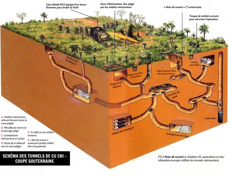 Quelques décennies plus tard, pendant la guerre contre les États-Unis, ces tunnels prennent une tout autre dimension. Le réseau s’étend alors sur plus de 200 kilomètres sous la terre rouge du sud du Vietnam. Ce véritable labyrinthe souterrain devient un outil essentiel pour les combattants vietnamiens : on s’y déplace à l’abri des bombes, on y communique, on y soigne les blessés, on s’y réunit, et parfois même… on y vit pendant plusieurs semaines.