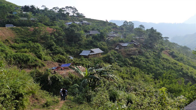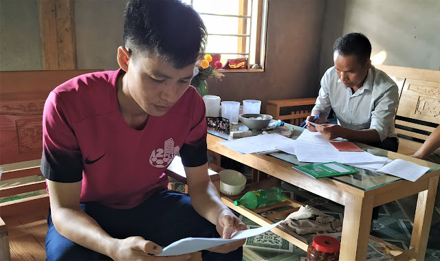 Después de una hora de caminos de montaña, finalmente llegamos al pueblo de Lao y es en la casa del jefe del pueblo donde Bau revisa sus proyectos.