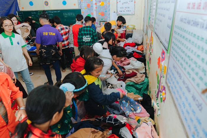 De plus, « le marché 0 VNĐ » à l’école de Me Lau B s’est déroulé animé. Tout le monde a a recu des cadeaux (seaux, pots, paniers…), y compris des articles quotidiens, de la nourriture et des vêtements. Nous avons vu la joie sur les visages des habitants et des enfants. Leurs sourires nous faisaient chaud à notre cœur.