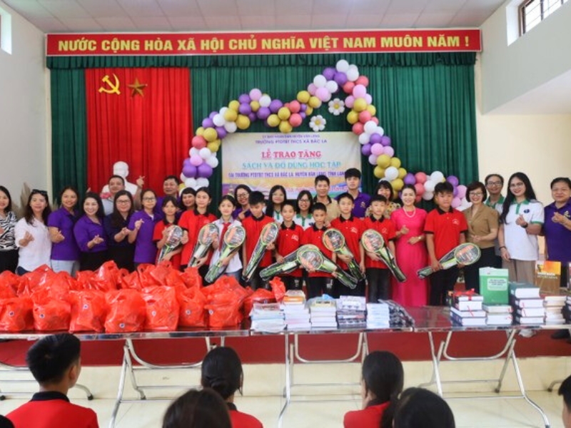 À l’école secondaire ethnique semi-internat de Bắc La, district de Văn Lãng, nous avons remis de nombreux cadeaux, dont des livres scolaires et de connaissances, des fournitures scolaires, des équipements sportifs, des friandises et cinq bourses d’études (d’une valeur de 500 000 VND chacune) à cinq élèves pauvres. Selon le rapport de l’école, la région est particulièrement difficile, avec une majorité de la population composée de minorités ethniques Tày et Nùng. L’école compte 70 élèves répartis en quatre classes, dont 30 internes. Environ 34 % des élèves viennent de familles particulièrement défavorisées. Les infrastructures scolaires manquent cruellement de ressources pour l’enseignement, les activités en plein air, le sport et les activités culturelles.